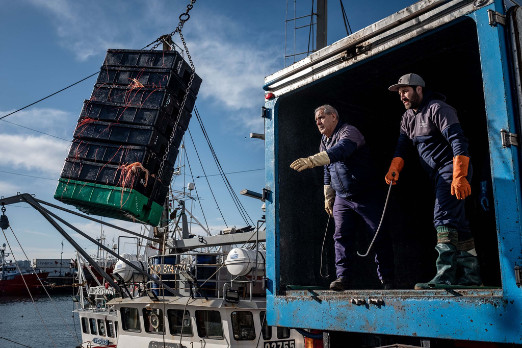 barco; langostino; cajón; trabajo; polea; cadena; mar; atlantico; Alimentación
