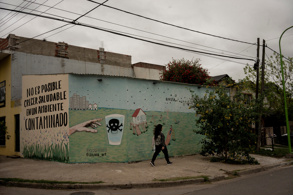 AGRONEGOCIO; monocultivo; mural; no es posible crecer saludablemente en un ambiente contaminado; glifosato; soja; defensa del Territorios; vertical; Exaltación de la Cruz; veneno; escuela; calavera; muerte