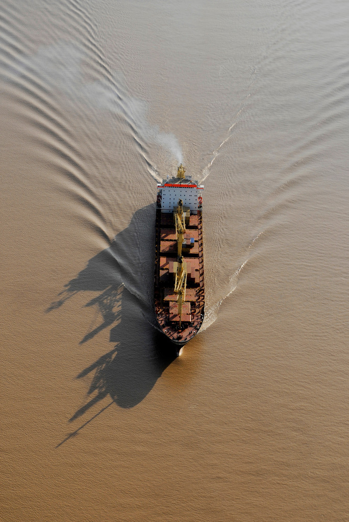 Agronegocio; hidrovía; comodities; exportación; cereal; venta; barco; Rio Paraná; sombras; dron; panoramica; importación; fuga; vrtical; marrón